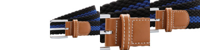 Two colour contrast striped belt. One size fits all, braided with stretch. Chrome buckle with faux leather piece for a neat finish on the end. Product contains no branded neck label. Removable Kimble or looped garment tags. Inner seam label holds important product information on one label with a second label containing brand information which can be cut-away. Please note old stock may contain a fixed branded label.